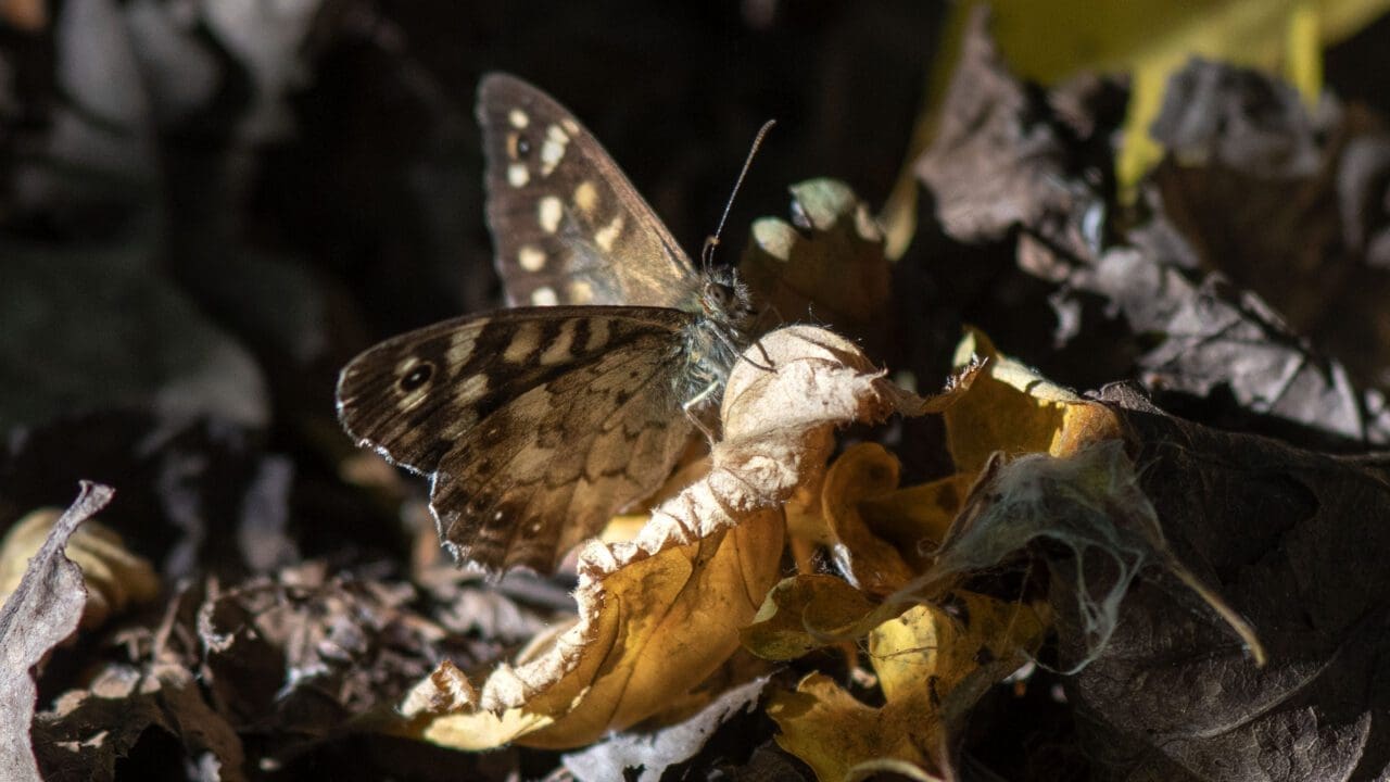 More common in the wooded end of our garden have been Speckled Wood butterflies. We watch the territorial male butterflies as they flit about in the narrow beams of sunlight that shine down through the hazel and willow canopy. They are looking for females while attacking other males in spectacular upward spiralling flights before settling on sunlit leaves and logs ready to attack the next male that comes along (image 7). Unlike most other butterflies, speckled wood butterflies feed on aphid honeydew high up in the tree canopy and so are not dependent on nectar producing flowers.