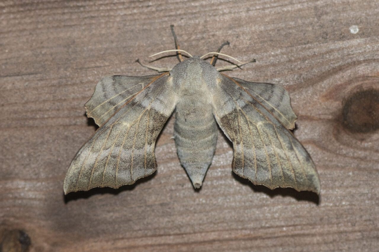 The rather fine butterfly-like Jersey Tiger moth Euplagia quadripunctata was first found as a migrant on the Isle of Wight in 1935 but not seen again in Hampshire until 1987. Now this species is often found along the UK Southwest coast and, in Hampshire, can be common on the Isle of Wight and the New Forest and is spreading occasionally north up to Basingstoke, east across Surrey, and around London (where they may have been introduced). However, the Hampshire distribution map shows a large hole around the Petersfield area and so I was very pleased to at last find a Jersey Tiger in our Stroud moth trap (image 8). Another spectacular moth is the Poplar Hawk-moth Laothoe populi which is much more common in our village. This moth (image 9) was attracted to light around our moth trap and landed on our shed wall. They differ from other hawk moths in settling with their hind wings forward from their front wings.