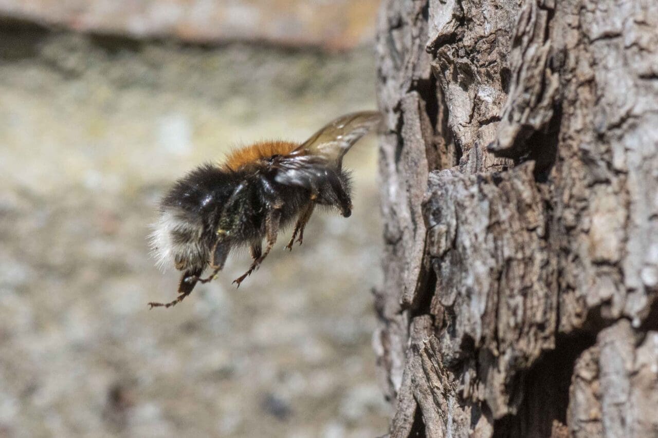 Queen bumble bees are out in abundance of several different species, all feeding on nectar and hunting out places in which to establish nests. Of these, perhaps the most distinctive is the Tree Bumble Bee with its ginger-coloured thorax and white-tipped black abdomen (image 3). First discovered in the UK only in 2001, the tree bee has now spread widely, making its nests in houses, bird boxes and assorted hollows. This particular bee was photographed just outside our kitchen window. Queens of the Common Carder Bee are out and about feeding on ground ivy on the village green. With it’s reddish ginger thorax, white hairy patches and an orange tail, this bee is a delight to see (image 4). The pretty queen Early Bumble Bees are also feeding on ground ivy, having an orange band behind its head, black thorax and reddish and pale orange bands on its abdomen (image 5).