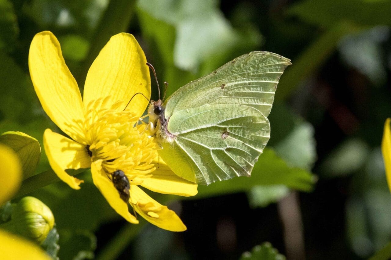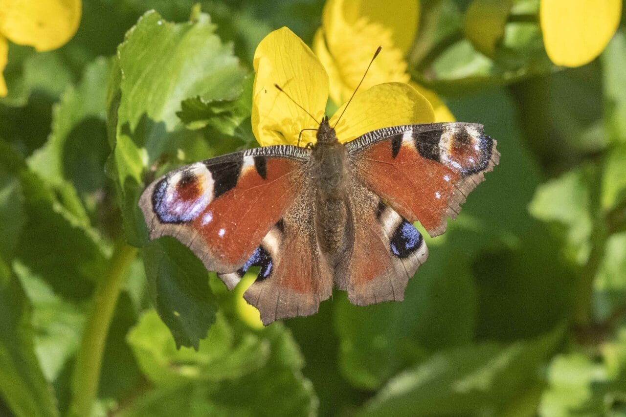 What a feast of butterflies we have had. One of the most splendid is the Peacock but that colouration is quite cryptic, when resting on the ground it is up and away before you spot it; this one landed on the marsh marigolds in our garden pond (image 6). One of the earliest butterflies to appear is the Brimstone (image 6). Brimstones flit fast back and forth across the garden but on one sunny day, this female posed for me on the marsh marigolds (image 7). Perhaps our most colourful butterfly is the Small Tortoiseshell. On the village green, small tortoiseshells rest on the dog-walked paths and fly up in front of you before you see them. They are also aggressive and fight off others in a flurry of wings. We have also seen the occasional Blue butterflies and Red Admirals and the village green is a good place to spot Comma butterflies.
