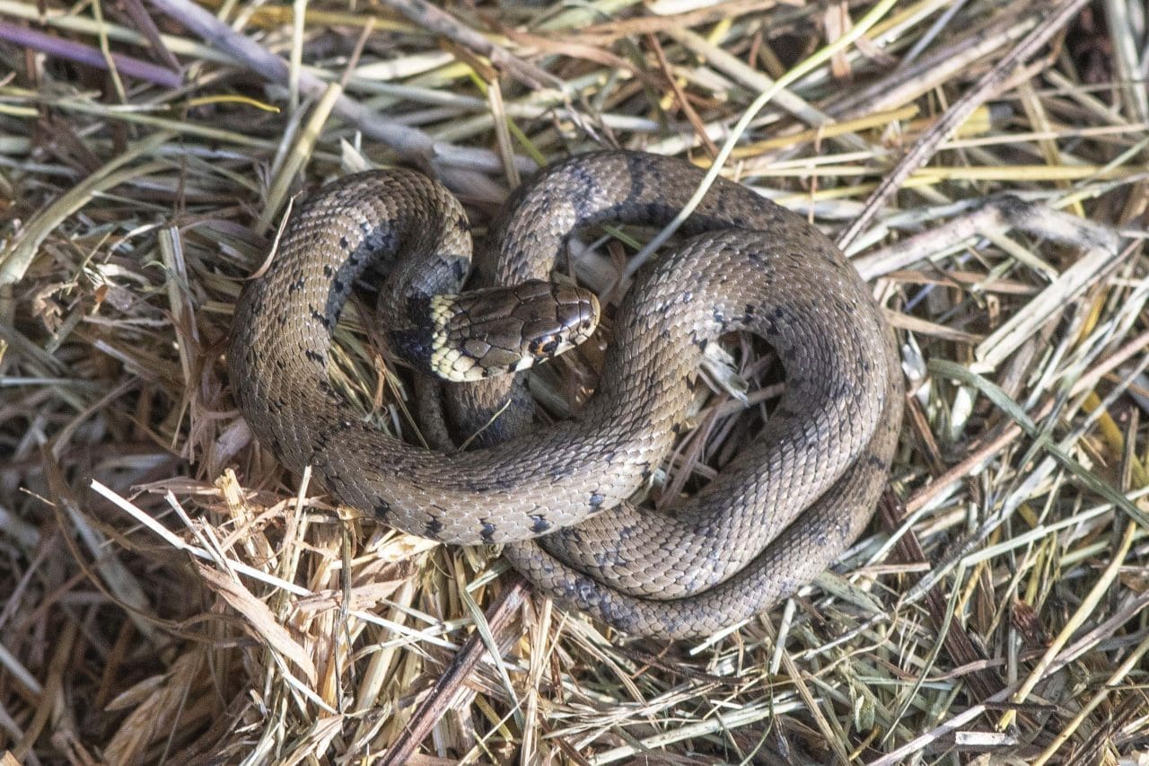 29 April was another warm day and our young grass snake was warming itself under one of our wildlife refugia tins (image 14). As it moved off, we could see that it was perhaps about 30cm long; adults can grow to over 100cm, exceptionally to 150cm. Grass snakes are common in the wetter western parts of the parish.