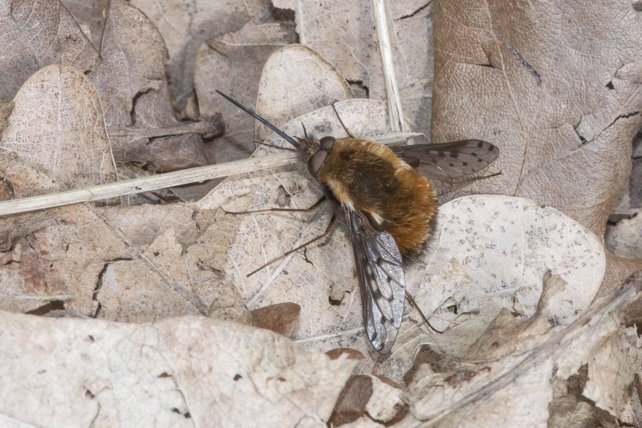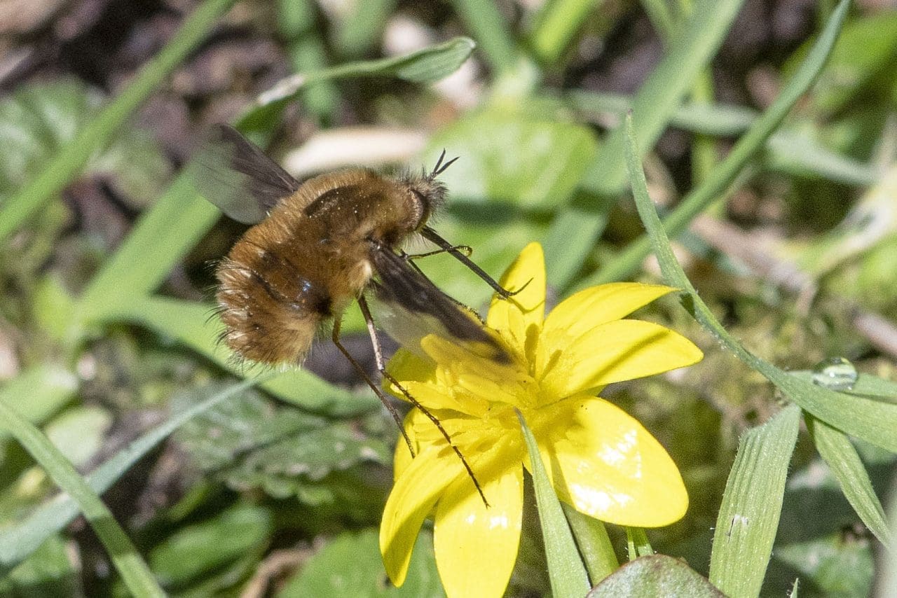 6 April continued the warm weather and the first bee-flies were out on the village green probing the flowers for nectar using their amazingly long proboscises. To my surprise both the dark-edged (image 4) with a dark leading edge to their wings and the dotted (image 5) with dotted wings were out. A few days later they appeared in our garden. These are true flies, part of the Soldier Fly group, and named after their furry bee-like appearance, although to me they are more like humming-birds, as they hover in front of flowers with their proboscises extended ready to probe deeply into flowers. There is a race with bee-fly enthusiasts to see who can see the first of the year, mine were sadly rather late.