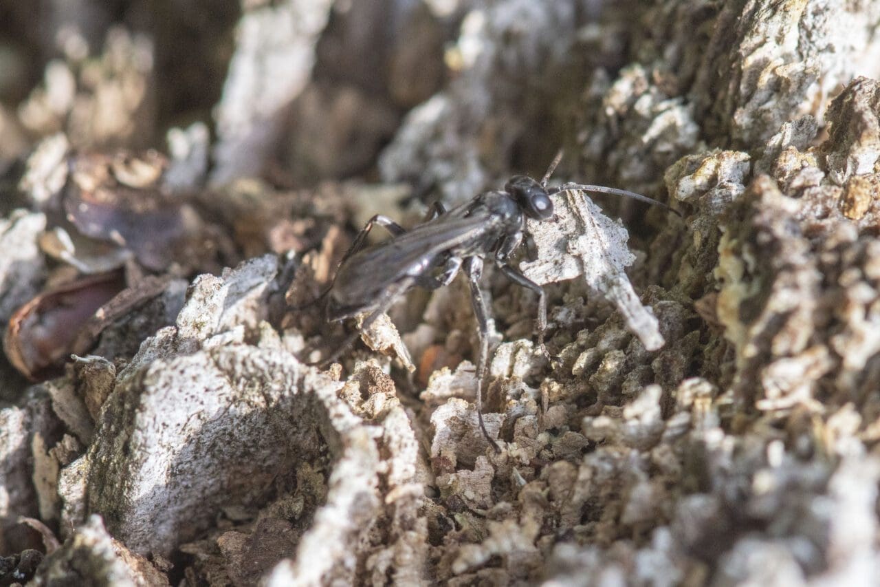 While lizard hunting, I headed for this weathered sunlit log where a lizard might be resting (image 3). No lizard but I spotted what turned out to be the small Black Spider-hunting Wasp Anoplius negerrimus running across the surface (image 4). I sat down and watched this tiny wasp through the camera lens and found it was collecting small wood fragments in its jaws and piling them up in one location and then taking those of the right size down into its nest burrow where it will have its eggs amongst a stash of paralysed spiders. Such a tiny black wasp only about 6mm long but so fascinating to spend 10 minutes or so peering into its life.
